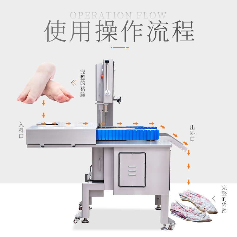 自动猪蹄分半机采用锯条高速运转,在通过食品级输送带将猪蹄进行切割,主要是对猪蹄分割设备,能将猪蹄、羊蹄、牛蹄等快速分割为两瓣,生产效率高,速度快,可直接对冷冻猪脚和新鲜猪蹄加工。猪蹄分半机的视频、图片、价格