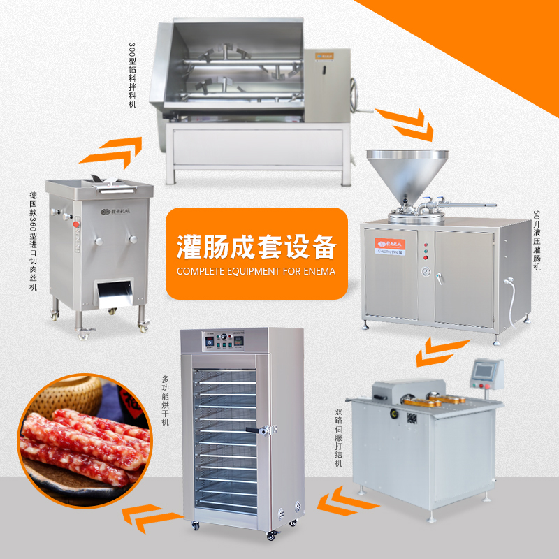 赣云专业供应灌肠成套设备,可以针对本地猪肉肠、广东香肠、腊肠、红肠等生产加工,产品远销海内外。本套灌香肠设备包含有:鲜肉切肉机、肉馅拌馅机、灌肠机(液压灌肠机)、电动扎线机、多功能烘干机等设备。选择我们的灌肠设备还可以为用户量身定制各种肠类、火腿加工生产设备。