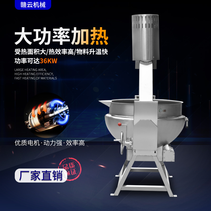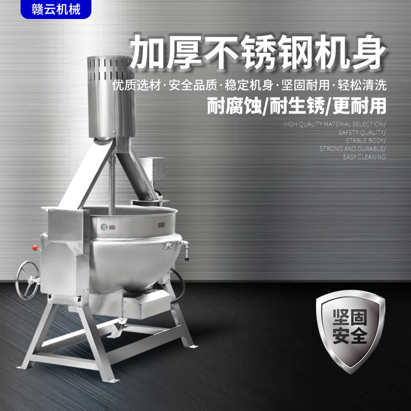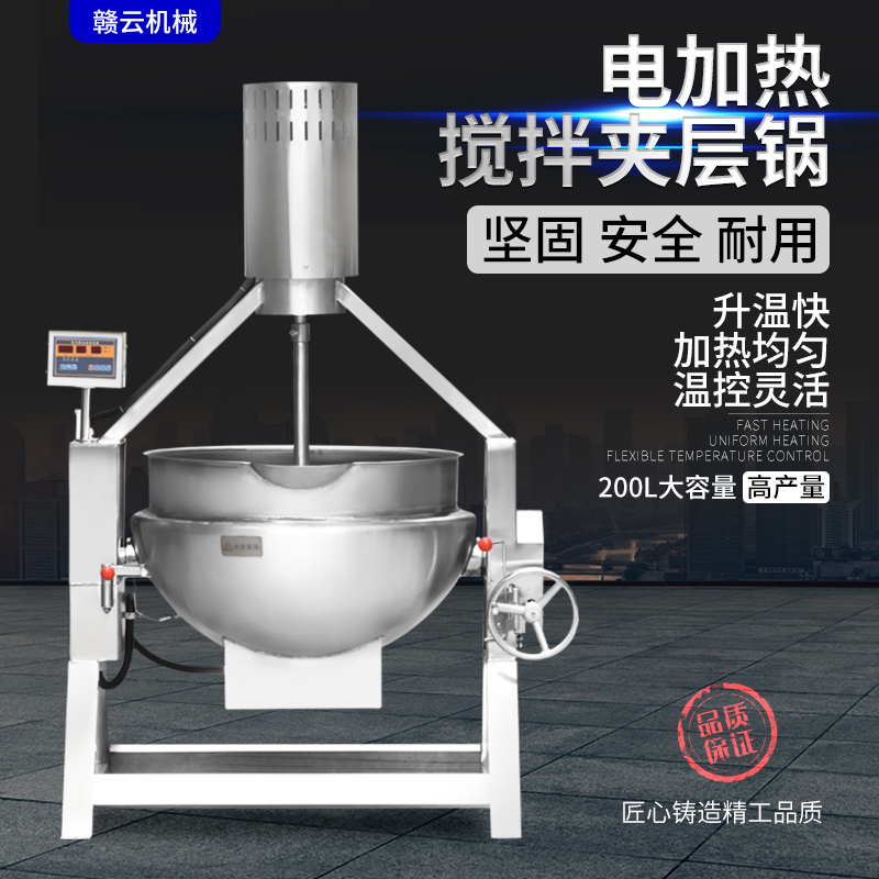 赣云电热可倾夹层锅,升温快,加热均匀,温控灵活。360度搅拌均匀受热,多用于商用厨房,中央厨房中,针对预制菜的加工使用的设备