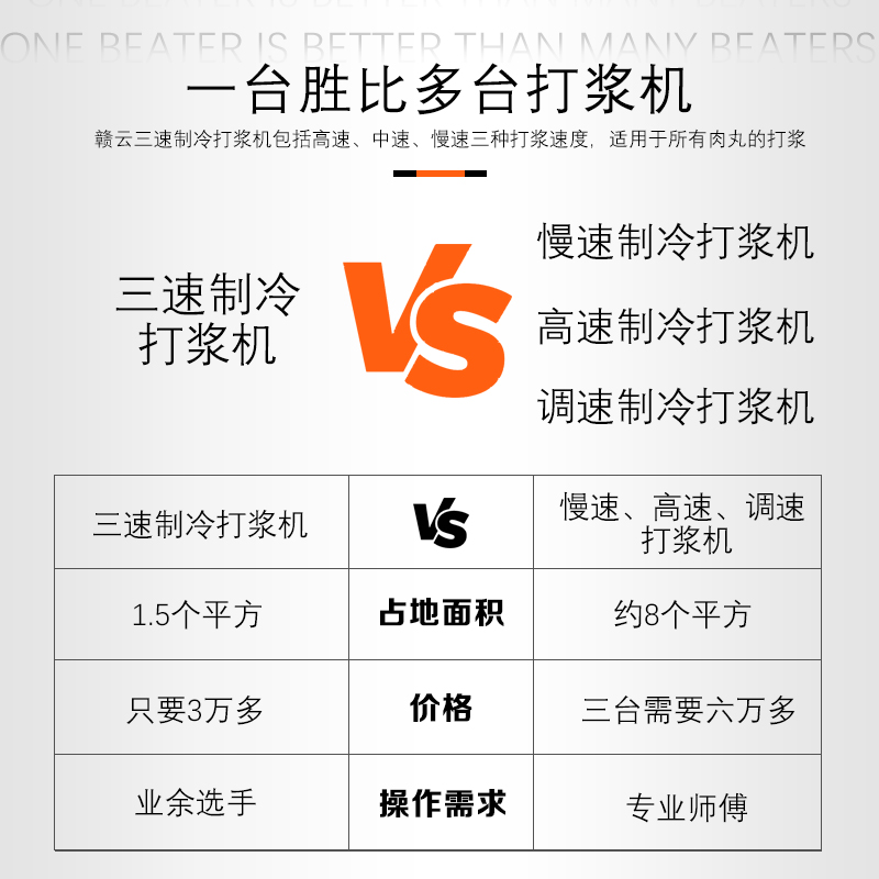 赣云GY-3S-45三速制冷打浆机是一款专为肉丸加工行业设计的高效智能设备,集高速、中速、慢速三种打浆模式于一体,配备压缩制冷系统和智能温控报警功能。该设备采用触屏操作界面,预设打浆时间,实现全自动化生产流程,占地面积仅1.5平方米,可替代传统三台单一功能打浆机,大幅降低设备投入成本与车间空间占用,是肉丸生产企业的选择。
