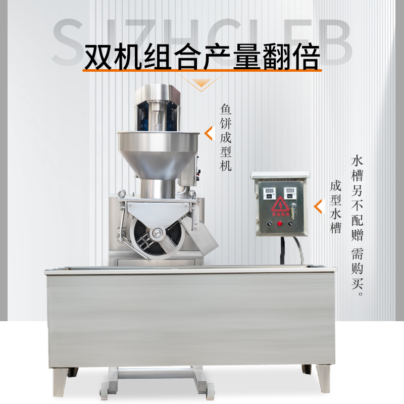 对于产量需求较大的客户,建议采用双机组合配置。两台成型机可同时工作,产量轻松翻倍至800KG/H。设备可共用水煮定型水槽,节省空间和能源。水槽需另行选配,采用不锈钢材质,配备加热和温控系统,确保鱼饼熟化效果一致。这种组合模式是食品加工厂的广泛选择。