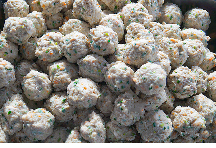 传统成型机制作的丸子容易出现密度不均、形状不规则等问题。赣云研发设计的摇摆成型机构,通过电机驱动成型头左右各摆动45度,在丸子成型过程中形成动态平衡。这种摆动使浆料在模具内均匀分布,切割后的丸子表面光滑无尾,内部结构紧密,口感更加Q弹有嚼劲,摇摆落入油炸槽后不易堆料导致粘连。适合制作直径40mm以上的大肉丸和狮子头。